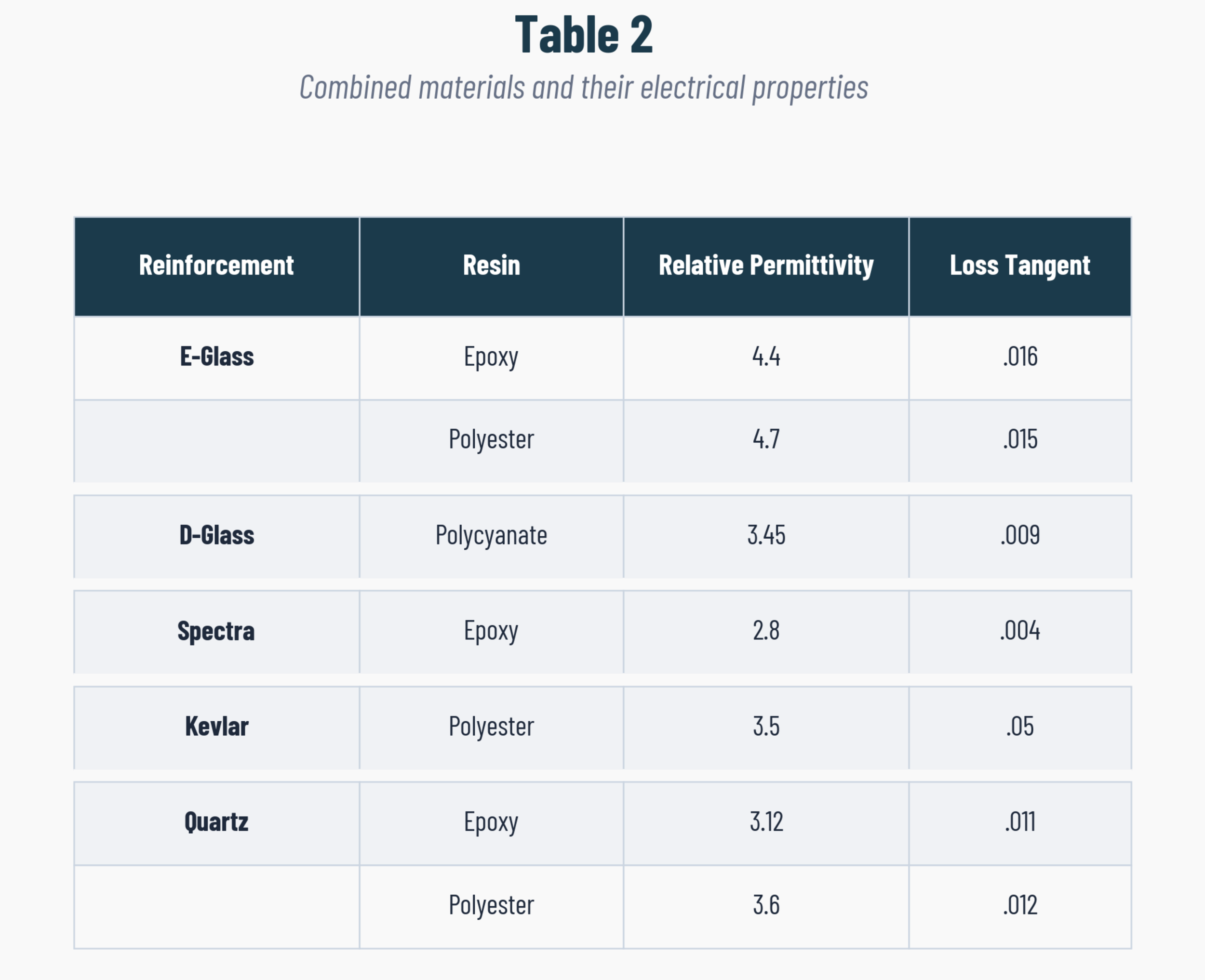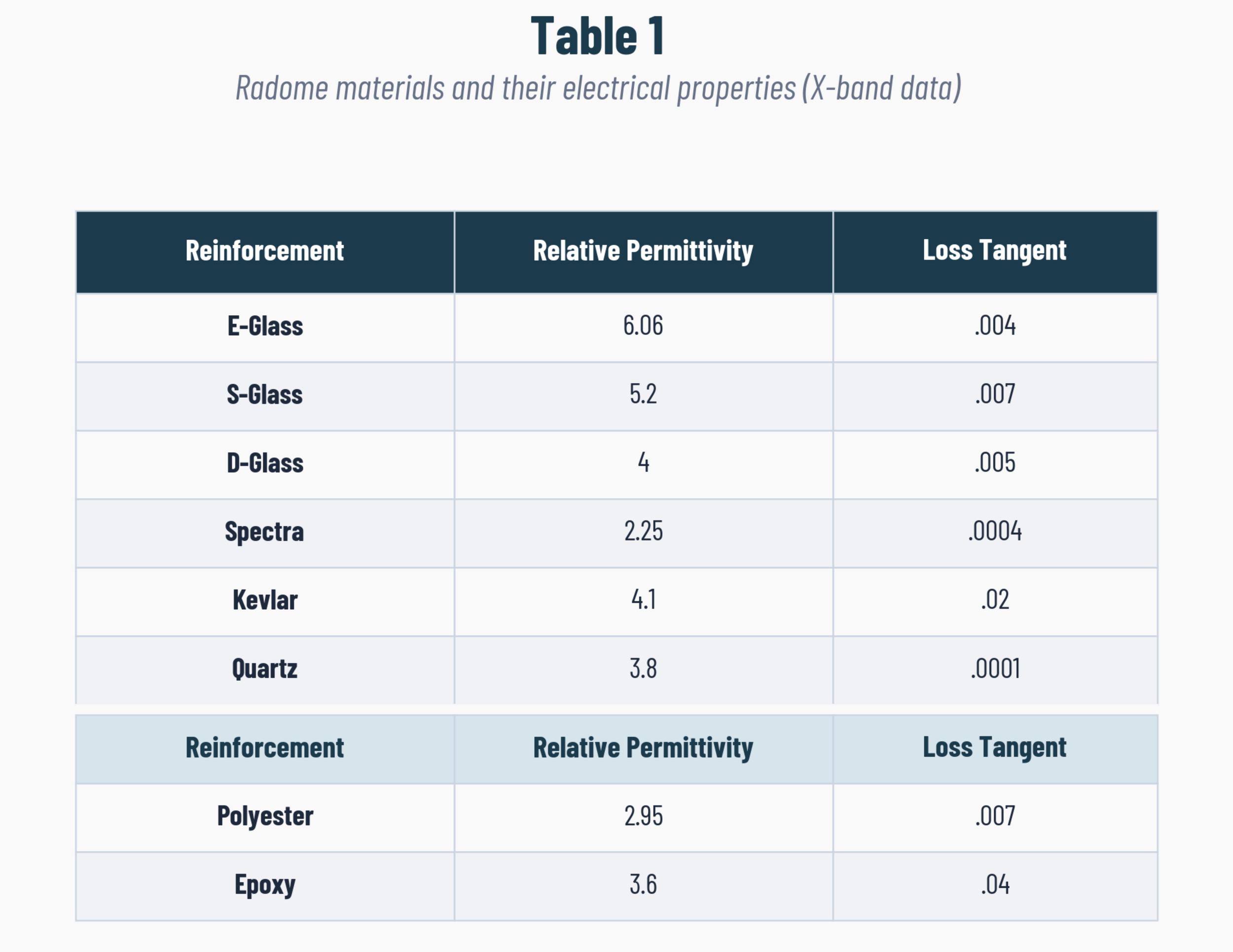 Materials used in the construction of radomes include fiberglass, quartz, graphite and Kevlar. Resins include polyester, vinyl ester, cyanate ester and epoxies. Construction techniques include hand lamination, infusion and prepreg fibers. Laminate consistency is also a component in radome performance and as such some manufacturers only produce radomes using prepreg materials. Core materials such as honeycomb and foams (thermo formable cores) are used. For high toleranced specifications a clean room is required. No carbon can enter the laminate as this can significantly reduce system performance. See Table 1 and 2.