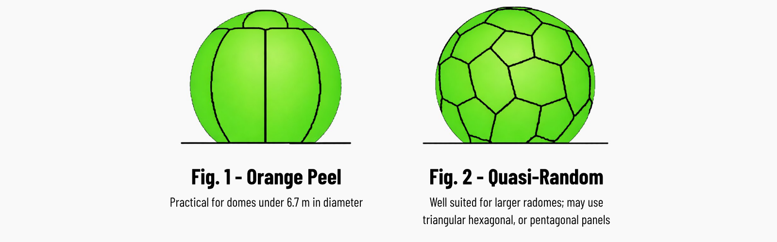 Framework shadowing is more complicated and depends on the radome geometry. Radome geometry is a term used to describe how the truncated sphere is separated into panel shapes. The mathematical process is known as tessellating the sphere. The orange peel style is practical for domes under 6.7m in diameter, while the Quasi-random is well suited for larger radomes. Not shown is the 5 panel “igloo” design.
